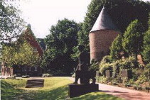 Jetzt befinden wir uns schon am anderen (alten) Ende der ehemaligen Stadtbegrenzung. An der teilweise erhalten gebliebenen Stadtmauer mit Gefangenenturm und kleinen Gäßchen können wir am Denkmal des Siegfried viele Gefallene auf Steintafeln wiederfinden, die für Dülken oder Vater Staat ihr Leben haben lassen müssen. Im Hintergrund ist das alte Rathaus zu sehen, in dem seit kurzem auch wieder das Standesamt für die Stadt Viersen zu finden ist. Wer also heiraten möchte, tut dies an diesem idyllischen Ort, schon ganz in der Nähe unseres Wahrzeichens, der Narrenmühle. Dorthin gelangen wir, wenn wir weiter auf der Lange Straße Richtung Süden wandern und uns unterwegs am Eiskaffee ein gemischtes Fruchteis mit Sahne mittnehmen (es ist ja gerade Sommer!). Dort, wo sich die Straße dann gabelt, erstrahlt, umgeben von viel Grün, die farbenfrohe alte Mühle;